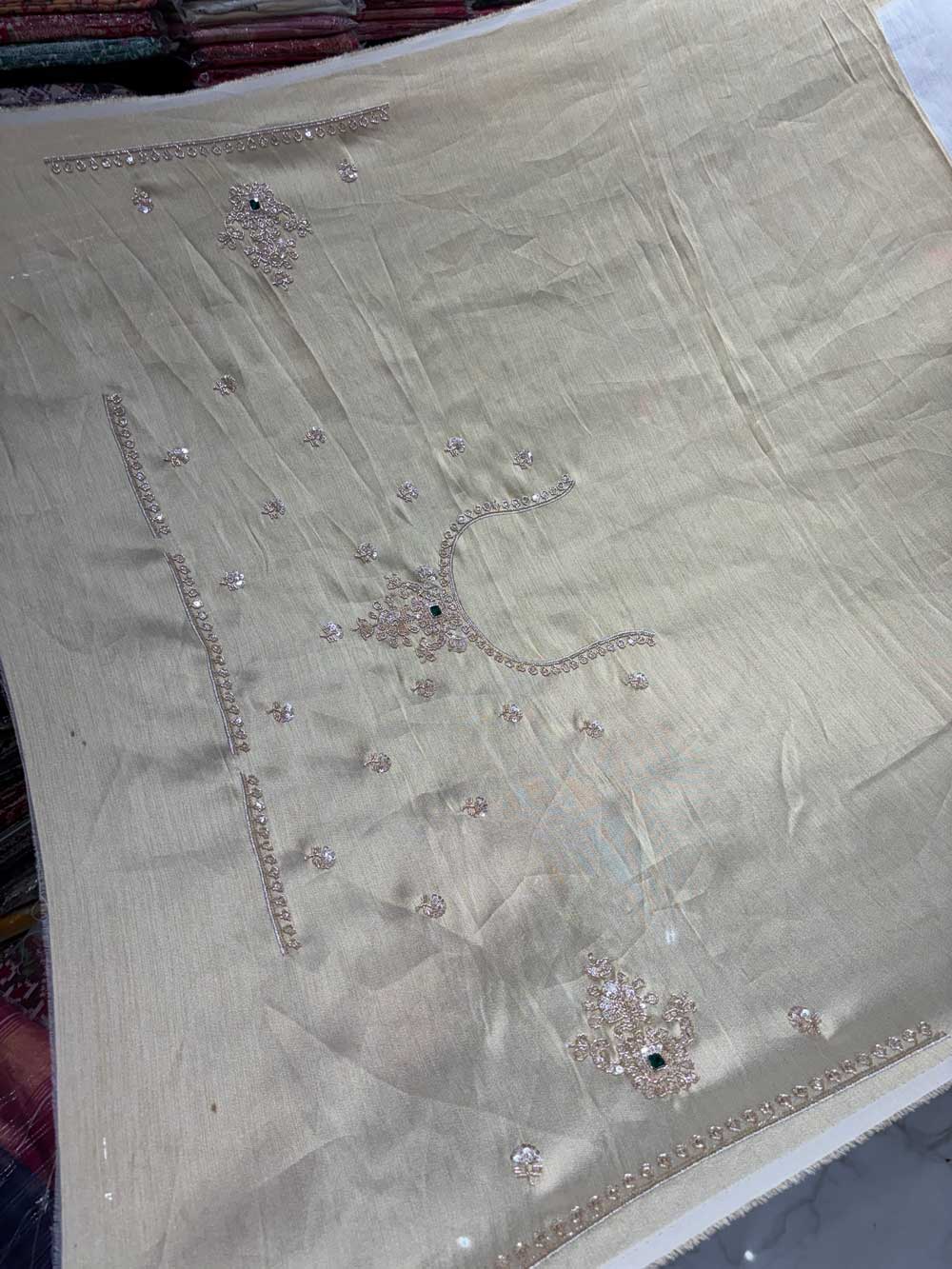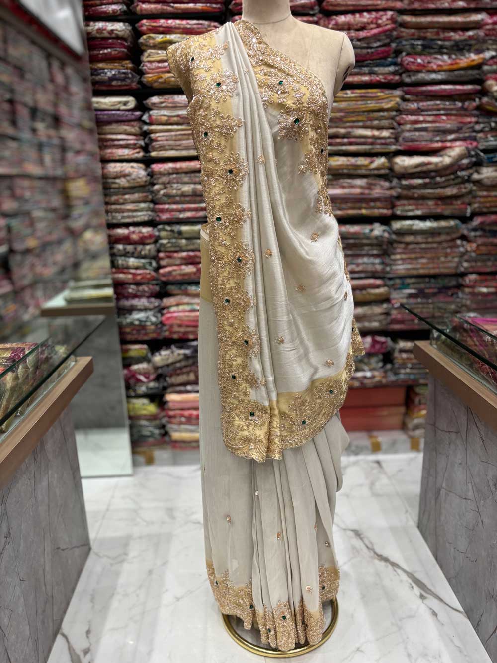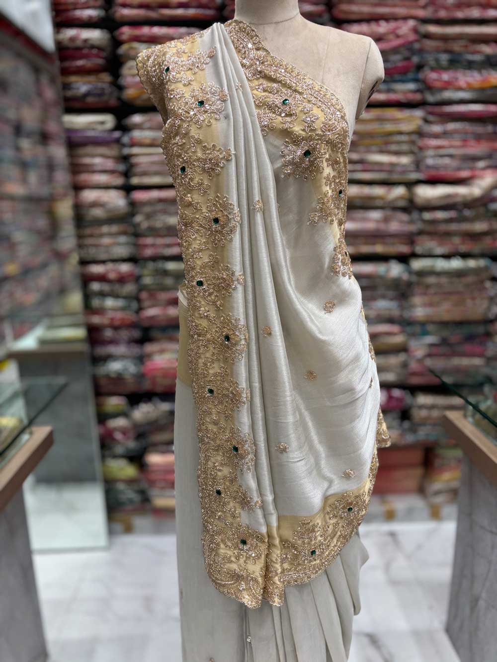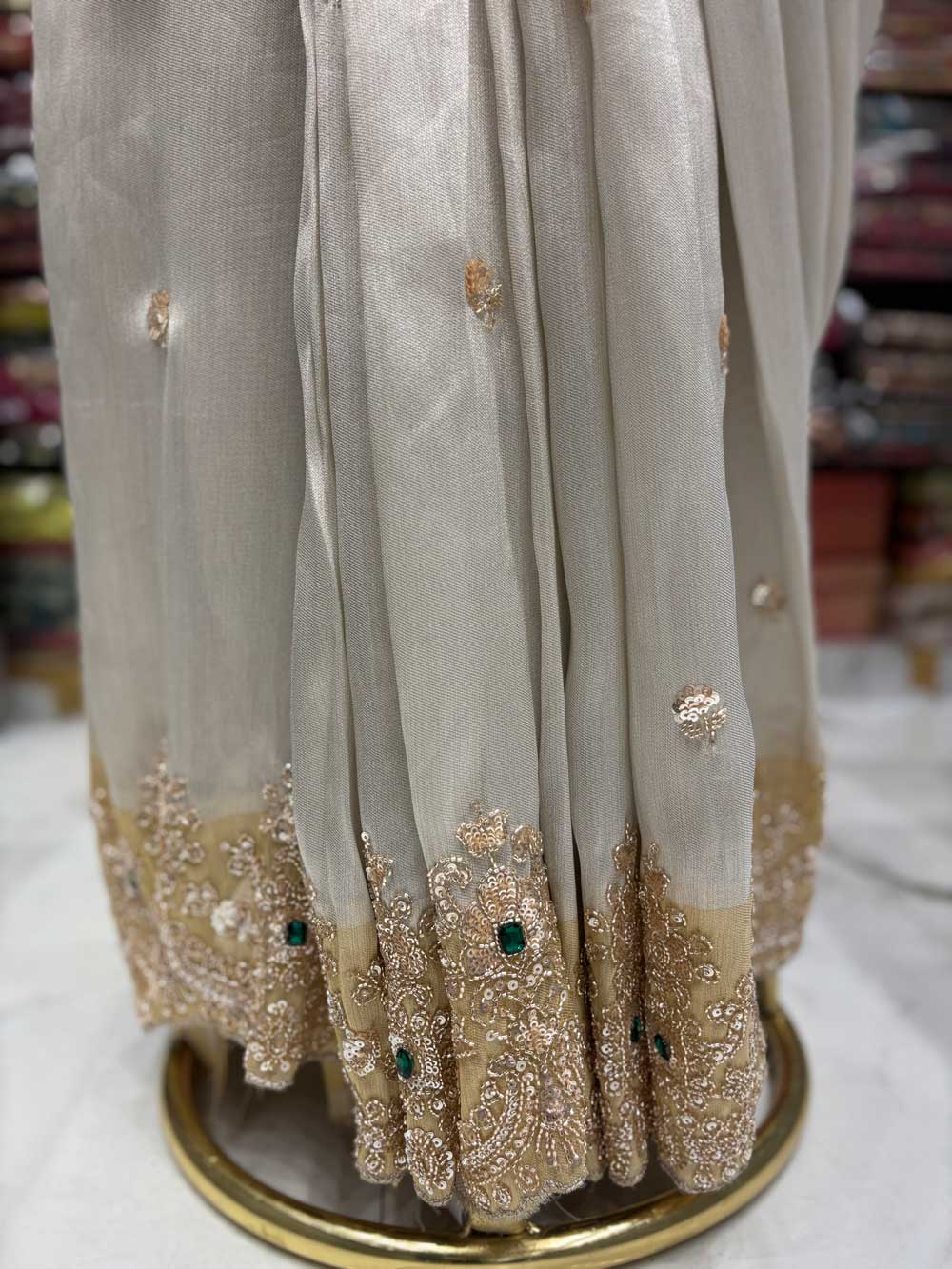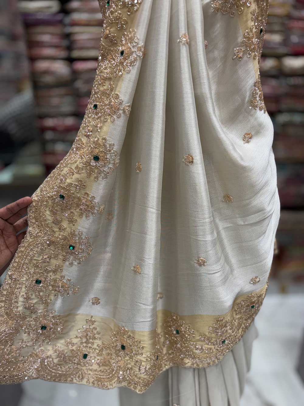 An exquisite Tissue saree featuring intricate Jewellery work and shimmering sequins. Adorned with delicate beads and precision cutdana work for a truly regal look.